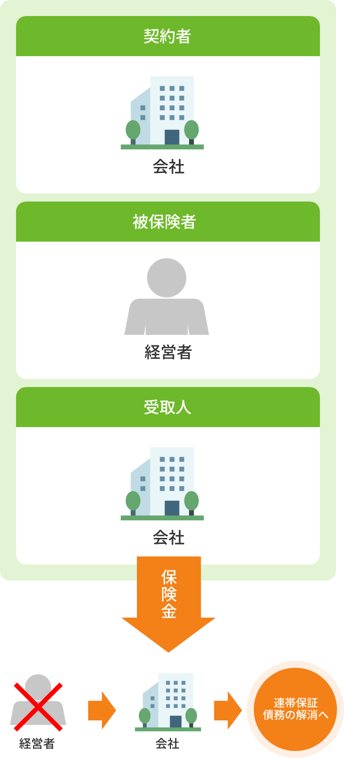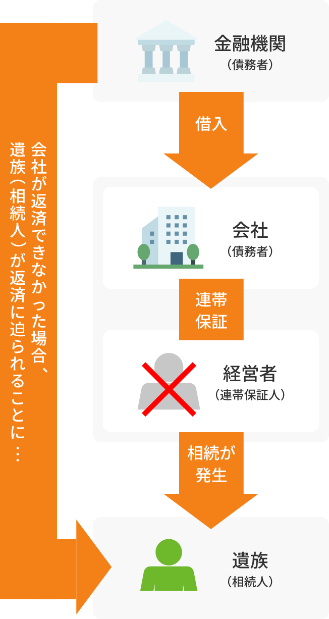 経営者の連帯保証債務の問題を解決しご家族の不安を取り除くには、経営者に万が一のことがあった際に借入金を全額返済できるような仕組みが必要です。生命保険を活用することで借入金の返済資金を現金で確保することで、経営者に万一のことがあった際に、会社は死亡保険金を現金で受け取ることができ、借入金返済に活用することができます。